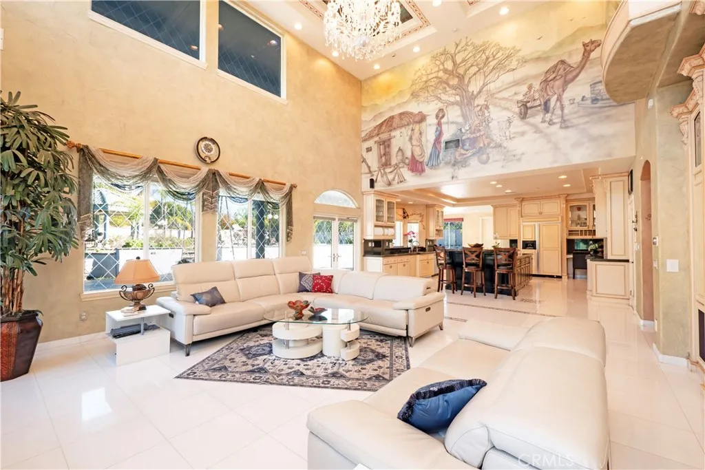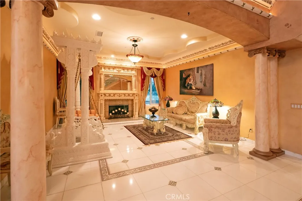 The original owners raised a large family here and loved to host events of all kindsand it shows in every thoughtful detail of this grand estate. From intimate family dinners to grand celebrations, this home was designed to create lasting memories and exceptional entertainment. Guests will be captivated from the moment they arrive. Walking past the welcoming sculpture, they'll enter through double beveled glass doors into a dramatic two-story foyer that takes center stage. Elegant mother-of-pearl inlay adorns the marble flooring, while rope lighting illuminates the soaring space. Surrounding this stunning foyer, discover a music alcove, two versatile bedrooms, a gracious living room, a formal dining room, and a bonus room perfect as library, wine cellar, home office, or bar tailored to your lifestyle. The second floor offers five spacious bedrooms, each thoughtfully positioned for privacy and a designed theater room that can convert easily to an additional bedroom. The crowning jewel is the opulent primary suite; complete with a private balcony, cozy fireplace, reading nook, luxurious 14k gold bathroom fixtures, makeup vanity, dual sinks, and a walk-in closet with built-in dressers. The chef's kitchen is where this home truly shines for entertaining. Featuring two stoves with 10 total burners, stainless steel appliances, granite countertops, extensive cabinetry, a walk-in pantry, and a massive island. It opens to a second, casual dining area and family roomideal for everyday gatherings. A large butler's pantry with a separate entrance makes catered events seamless as it lea