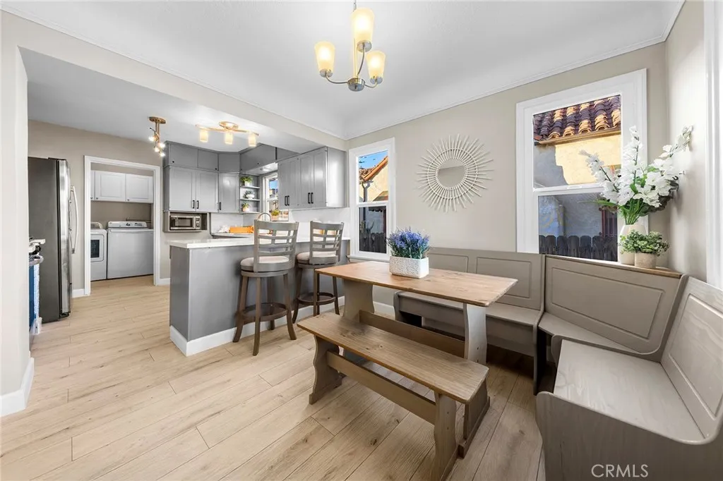 Beautifully updated Spanish-style home offering an exceptional blend of timeless charm, modern upgrades, and everyday comfort. This recently remodeled residence features new roof insulation, full copper plumbing, new windows, new interior and exterior paint, and individual mini-split A/C systems in each room for efficient, year-round comfort. Recessed lighting throughout enhances the bright and welcoming atmosphere. The spacious living room is filled with natural light and flows seamlessly into the formal dining room, creating an ideal setting for entertaining and gatherings. The home offers 3 bedrooms and 2 beautifully updated bathrooms. The primary bedroom enjoys direct access to the garden and features a spa-inspired en-suite bathroom with a new marble double-sink countertop, solid birch cabinetry with soft-close doors and drawers, a Jacuzzi soaking tub, and new porcelain tile flooring. The hallway bathroom is equally impressive, showcasing a marble double-sink vanity, soft-close cabinetry, LED smart mirror with anti-fog function, three color tones, and adjustable brightness, a custom frameless shower door with anti-water-stain coating, and new porcelain tile. The well-appointed kitchen includes a new stove, motion-sensor vent hood, refrigerator, and a cozy breakfast nook. Additional highlights include an individual laundry room and a charming built-in hallway workstation, perfect for remote work or study. The detached garage offers excellent ADU potential (buyer to verify), providing flexibility and future value. Enjoy indoor-outdoor living with a balcony off the dining