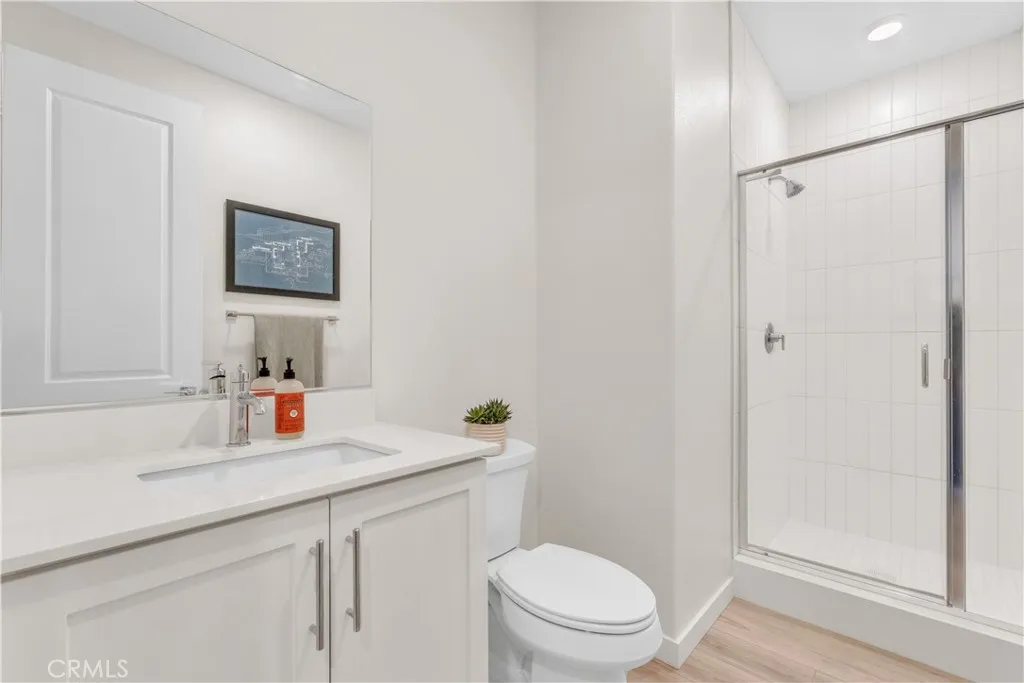 Experience exceptional modern living in the highly coveted FivePoint community of Valencia. Built in 2022, this tri-level townhome blends contemporary luxury with everyday comfort. Set in a prime location with inviting views, this light-filled 3 bedroom, 3.5 bathroom residence offers approximately 1,840 square feet of thoughtfully designed living space. The main level showcases an open-concept great room with living and dining areas that flow seamlessly into a sun-drenched kitchen. Enjoy a spacious center island, stainless steel Whirlpool appliances, walk-in pantry, Quartz countertops, and crisp white cabinetry. Wide-plank wood-like flooring and abundant natural light create a warm, tranquil atmosphere throughout. The upper level hosts the elegant primary suite, complete with plush carpeting, a generous walk-in closet, and a spa-inspired bathroom featuring dual vanities, a separate shower, and a soaking tub. An additional ensuite bedroom and a convenient laundry closet with side-by-side washer and dryer complete this floor. The lower level offers a charming entry and a versatile third bedroom, ideal as a family room, office, gym, or guest space and with sliding glass doors opening to the front courtyard. This level also includes a full bathroom with walk-in shower and direct access to the attached two-car garage. Designed for todays lifestyle, the home includes eco-friendly upgrades such as solar panels, an Ecobee thermostat, EV charger, water filtration system, and a tankless water heater, enhancing both convenience and sustainability. Residents of FivePoint enjoy an array