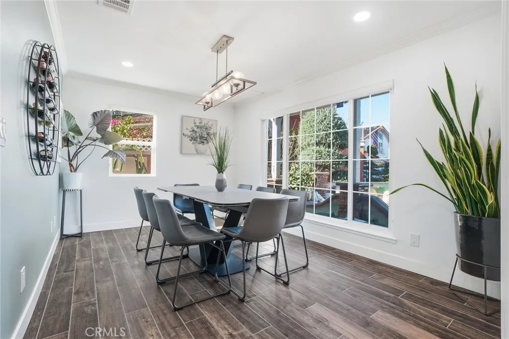 Tucked at the end of a quiet cul-de-sac, this spacious two-story home offers a thoughtful layout and quality updates throughout. The main level is filled with natural light and features porcelain tile flooring, recessed lighting, and an easy flow between the kitchen, dining, and living areas. The kitchen is designed for both function and style, featuring a six-burner range, stainless steel appliances, generous counter space, a breakfast bar, and a custom walk-in pantry. The living area is anchored by a stone-accented fireplace, creating a warm gathering space. A flexible room on the main floor works well as a home office, playroom, or additional living space. Oversized sliding doors open to a private backyard with a covered patio, built-in bar and grill area, open lawn, and mature fruit trees including orange and dragon fruit. Upstairs, the primary suite offers an updated bath with dual sinks, walk-in shower, and soaking tub. Three additional bedrooms share a refreshed hall bath. A custom media and family room completes the upper level with surround sound, a wall mural, and access to a private balcony. Located near local schools, shopping, dining, and everyday conveniences, with easy access to major freeways for commuting throughout Orange County.