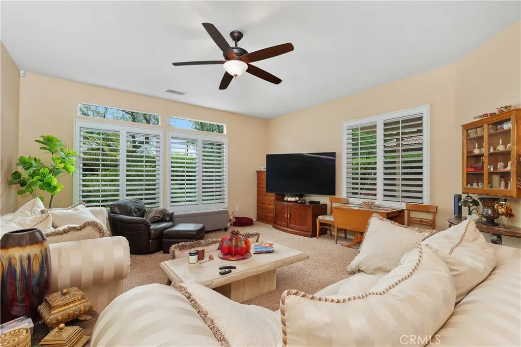 RARE 2079 SQ FT. HOME IN BEAUTIFUL HERITAGE PALMS CC! Active Adult Community. This 3 bedroom & 2 Bath home offers spacious and elegant layout that is ideal for comfortable living and entertaining. Open formal LIVING & DINING rooms with large FAMILY ROOM, all with VAULTED CEILINGS. Neutral carpet in bedroom and 16" TILE in high-traffic areas. WHITE PLANTATION SHUTTERS AND 5 CEILING FANS for breezy, refined ambiance. A GOURMET KITCHEN with 5 BURNER GAS STOVE; Electric Convection Double Oven; Raised-panel hickory cabinets; Corian countertops; Solar tube for natural lighting. All APPLIANCES included. LAUNDRY ROOM conveniently located off kitchen area. MASTER SUITE includes a WALK-IN & mirrored closet; dual sinks; deep soaking tub with a separate shower. Entire house is ACCESSABLE! EXPANDED GARAGE with BUILT-IN CABINETS; work bench; room for a Golf Cart and durable "SNAP-IN" BLUE TILE FLOORING. The exterior has PROFESSIONALLY LANDSCAPED front yard with a cozy patio. The expansive ENTERTAINERS BACKYARD features: a SPOOL (Spa & Pool Hybrid), with a CASCADING WATERFALL & pet -friendly side yard. Community amenities include GOLF, TENNIS, PICKLEBALL, CLUBHOUSE, POOL, SPA FITNESS CENTER and more! Low HOA fees!