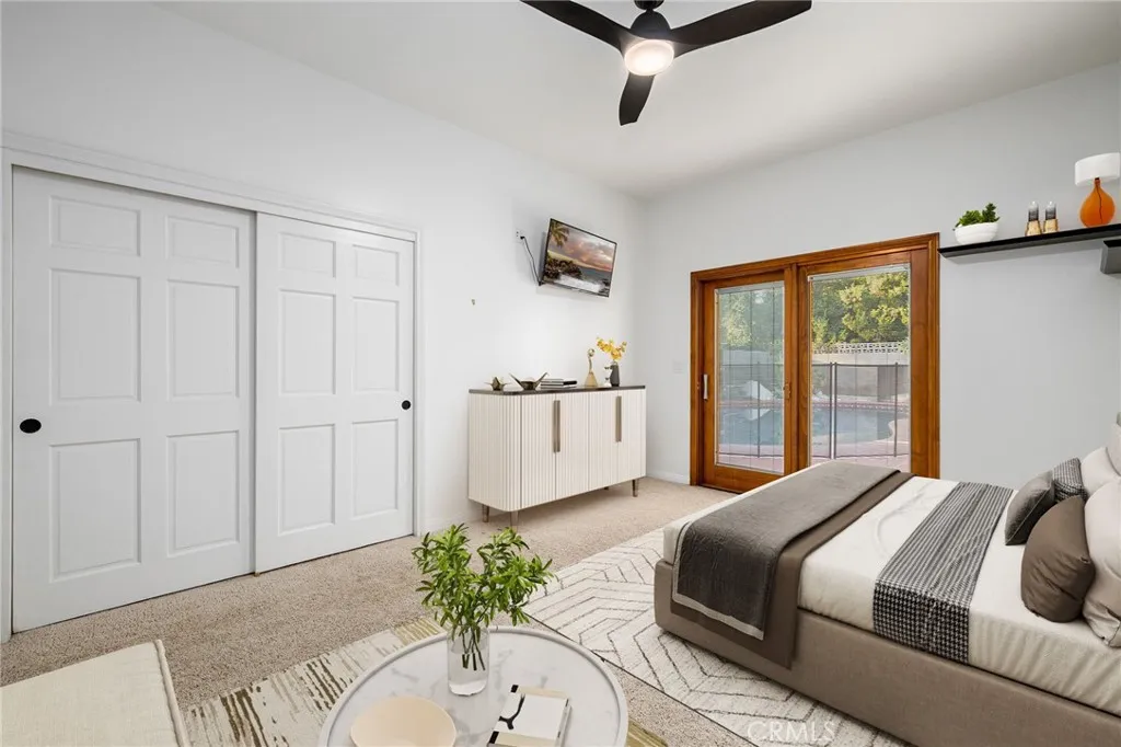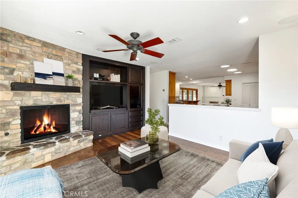 Prime Towne Ranch offering rare multigenerational living on a single level, anchored by a private, resort-style backyard with pool and spa. Set on an expansive lot, the property is introduced by manicured front landscaping, a long brick driveway, and a brick walkway leading to a covered stone patio and welcoming front entry. Inside, engineered hardwood flooring flows through the main living areas. The front living room features recessed LED lighting and large windows overlooking the front yard. The family room centers around a painted white, floor-to-ceiling brick fireplace and custom French sliding doors with beveled, leaded glass, opening seamlessly to the kitchen. The kitchen is appointed with custom wood cabinetry, granite countertops, a tiled backsplash, and stainless steel KitchenAid appliances. A picture window and glass panel door provide backyard access, while a peninsula offers countertop seating. Adjacent, a breakfast nook includes a built-in matching buffet, workstation, and pantry, transitioning into a second living area with a floor-to-ceiling stone fireplace, hearth, built-in media niche, and pony wall that creates a semi-private setting. A centrally located laundry closet with bi-fold doors and storage is conveniently positioned at the end of the hallway. The primary suite features plush carpeting, ceiling fan, abundant natural light, direct backyard access, and an en-suite bath with dual vanities, center soaking tub, and custom tiled walk-in shower with glass enclosure. A fully built-out walk-in closet includes custom organizers. Four additional bedrooms in
